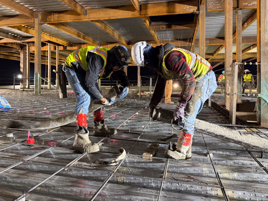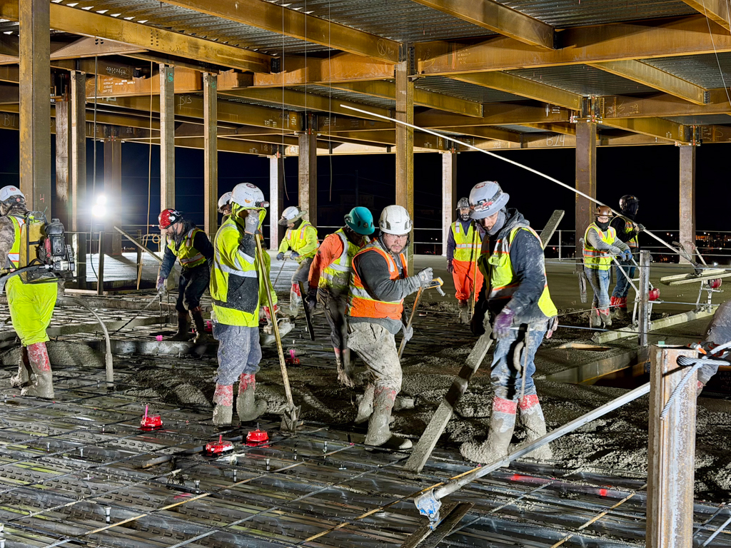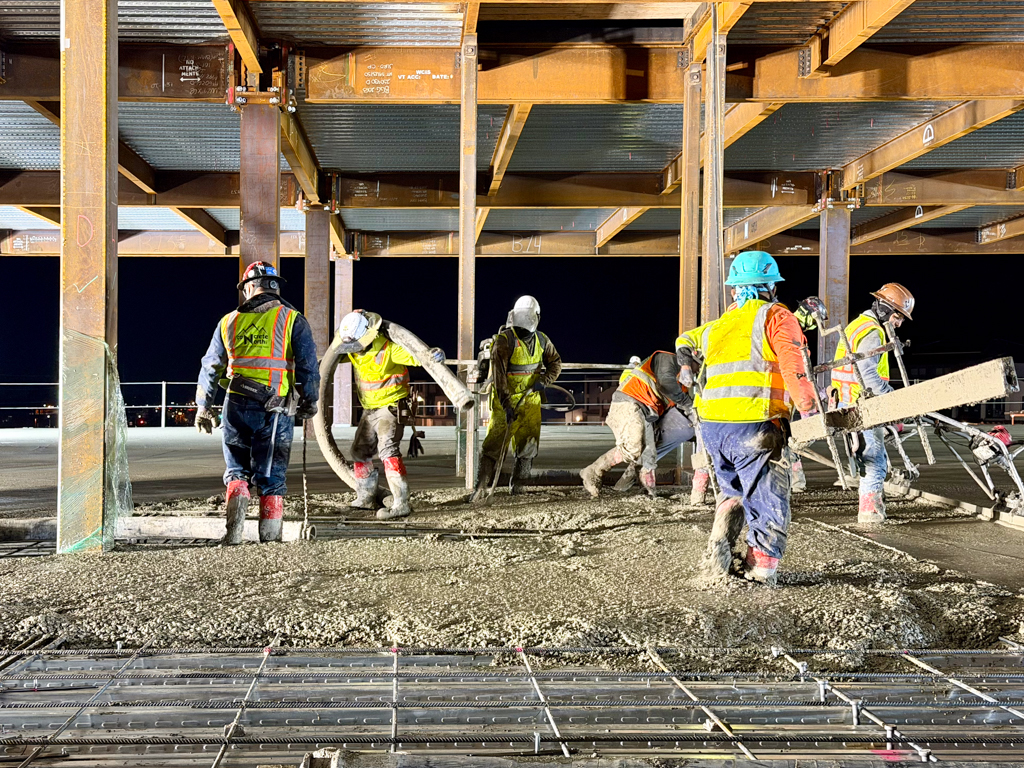 On Thursday, January 29, crews from Concrete North and Interstate Concrete began work at 2 a.m. Together they placed 260 cubic yards of concrete, covering nearly 19,000 SF of deck. This marks just one of several major concrete operations on the project, with four additional pour days still ahead.