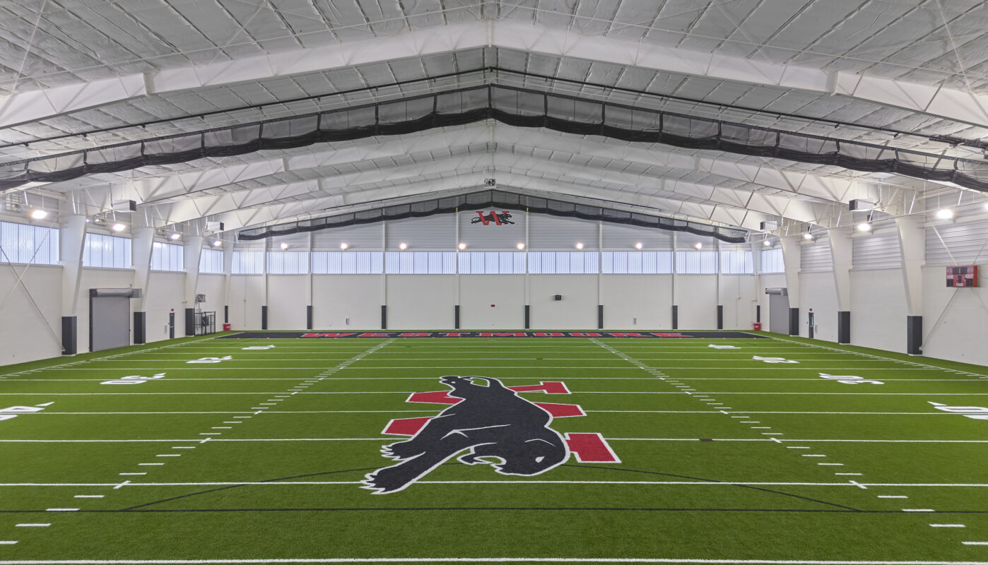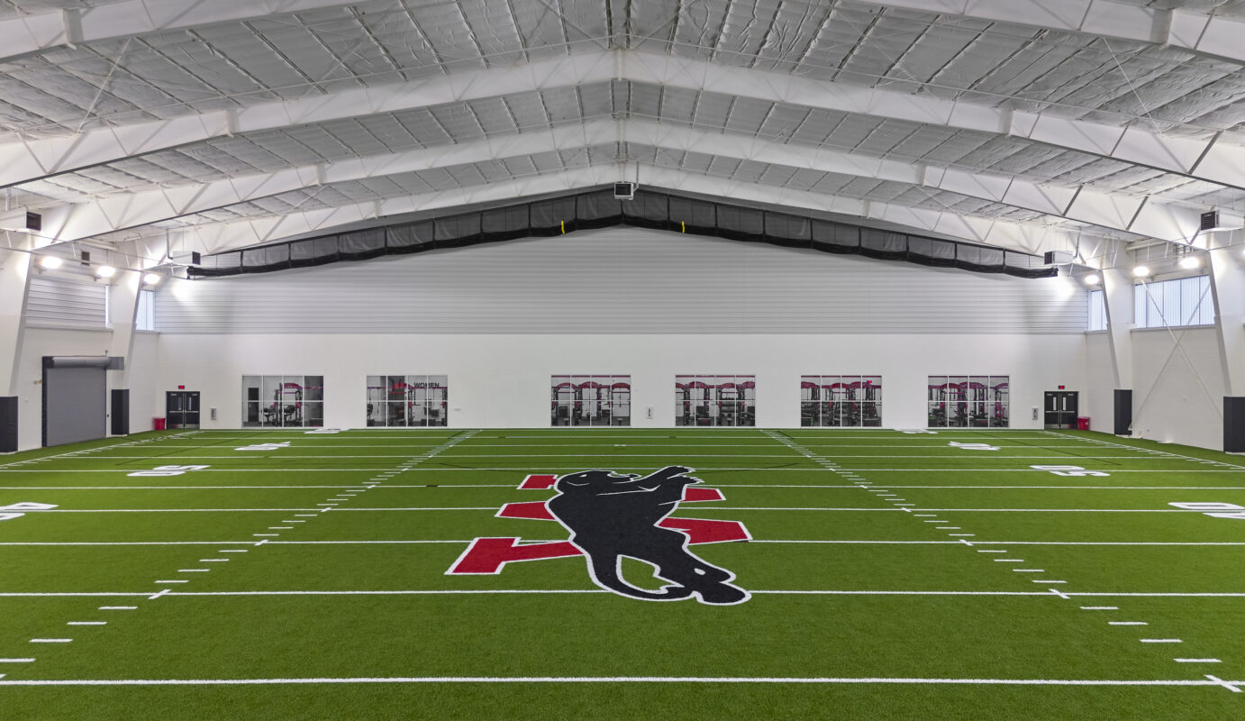 The 53,000 SF multipurpose indoor practice facility was constructed using a pre-engineered metal building (PEMB) system, with a durable enclosure composed of masonry and translucent wall panels that provide natural lighting throughout the interior. The structure houses two primary spaces: a 45,000 SF synthetic turf field designed for flexible use across football, soccer, baseball and softball, and a 5,000 SF weight room built to support athletic training and conditioning. Designed for year-round use, the facility supports a wide range of athletic programs, team practices, and offseason training.